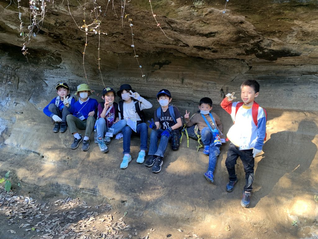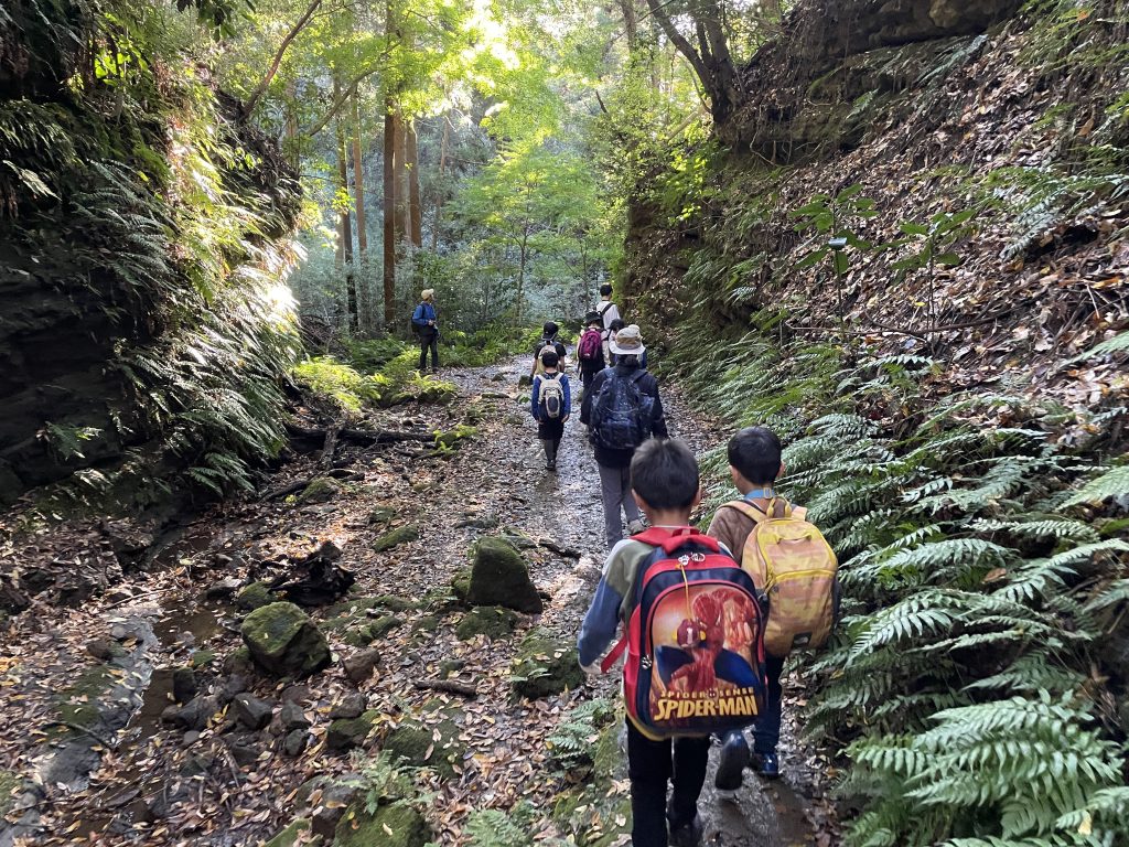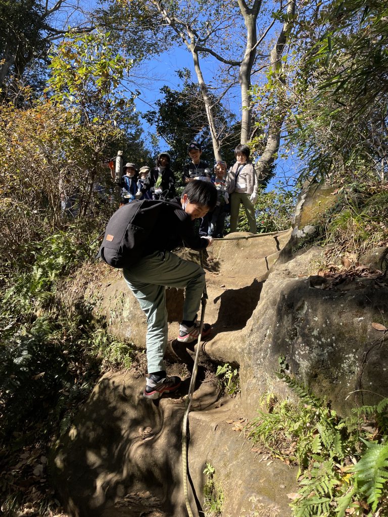 さて、ここからがようやく天園ハイキングコースです。ハイキングコースには景色がいいところも多いですが、紐を使わなければいけないほど急な道もあります。班になって、みんなで慎重になっていきました。