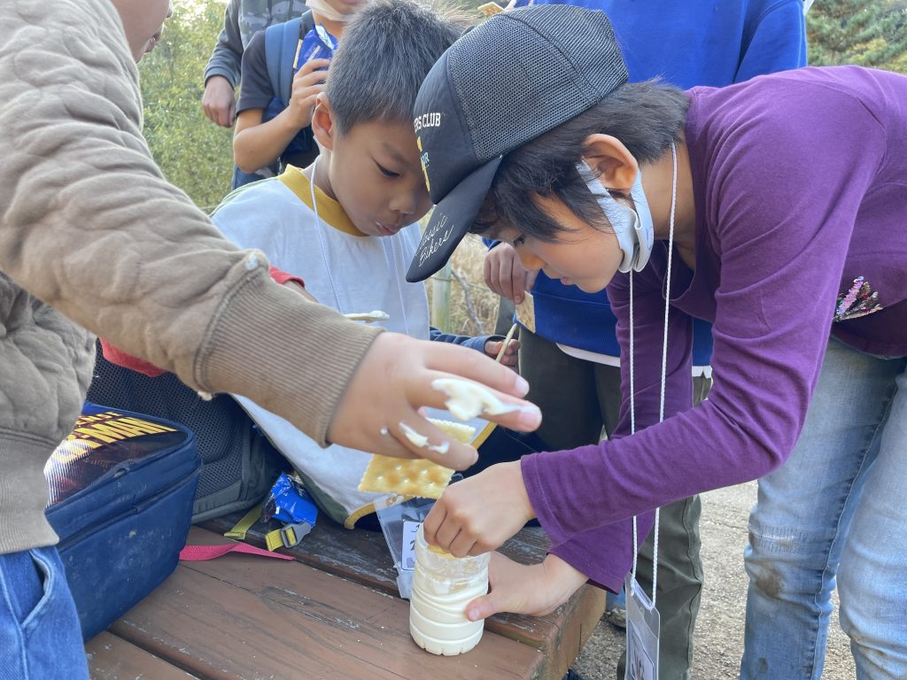 山道を進んでいき、ついにお昼ご飯の広場に到着しました!広場でレジャーシートをひいてみんなでお昼ごはんです。