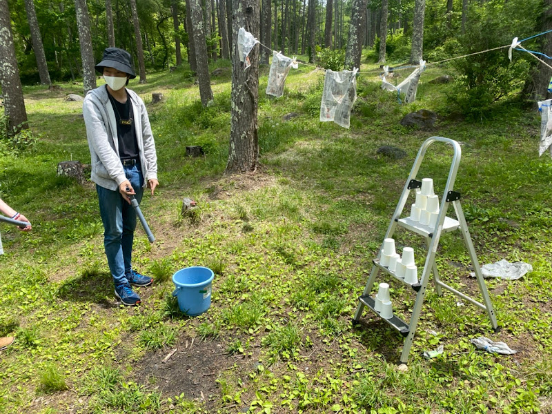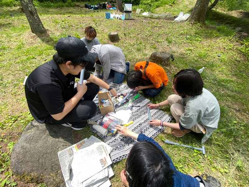 翌日は、水鉄砲作りを行いました。自分の手作り水鉄砲で的当てをすることができたり、近くの川にもっていって遊ぶことができたりします。